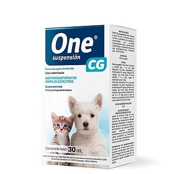 One® CG suspensión está indicado en perros y gatos a partir de las 3 semanas para el control y tratamiento de parasitosis ocasionadas por coccidios ( Cystoisospora spp.) protozoarios (Giardia spp.) y nematodos (Toxocara spp., Ancylostoma spp., Toxascaris spp., Trichuris spp.)